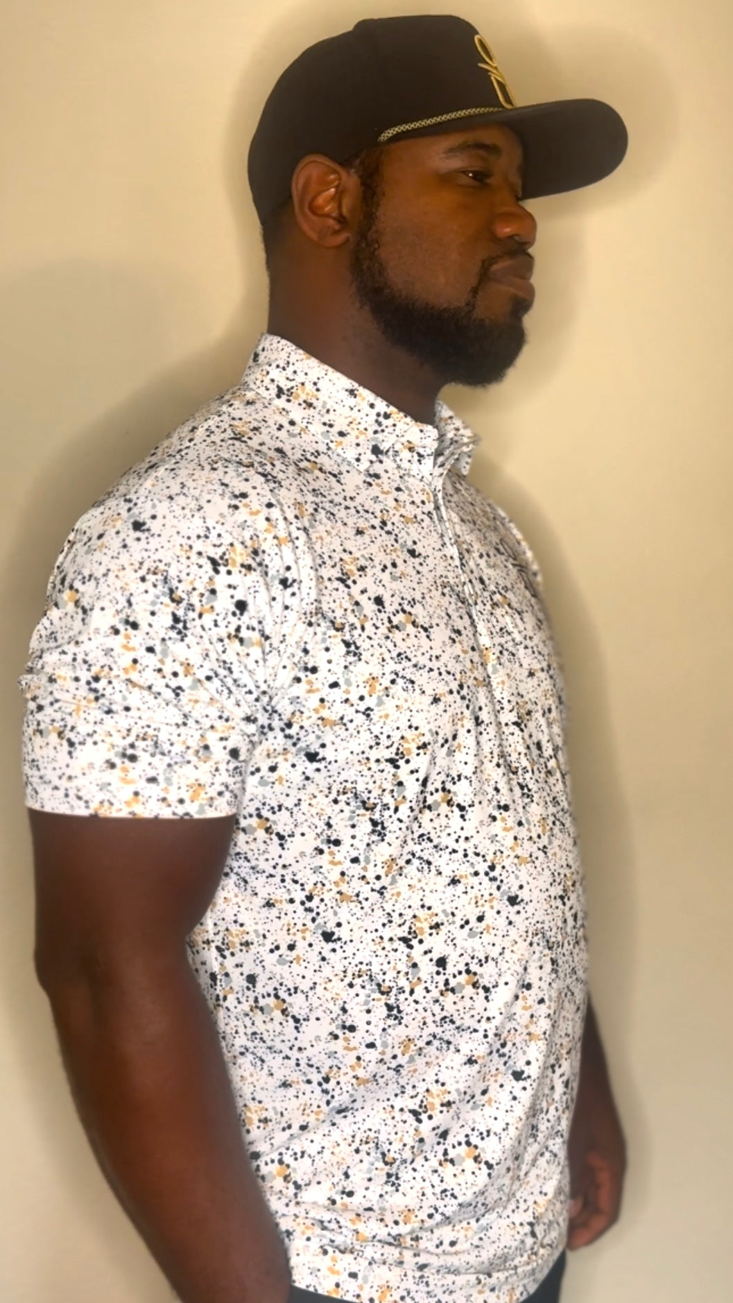 Play with style and confidence in the Gold Paint Splatter Golf Polo Shirt — where sport meets art.